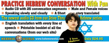 | Practice Hebrew Conversation with Fun! (Series: Drive-Thru Hebrew) 1 Audio CDs - 67 minutes The newest product of our "Drive Thru Hebrew" series - Learn Hebrew as you Drive! Many of you requested an audio CD to which they can listen at leisure time or while driving and still learn to speak Hebrew. Well, we "custom made" it to your requests! Includes a 16-page downloadable and printable manual. 25-conversation segments and a short-story. 2-levels, with and with-out English. Listen to a preview: |
